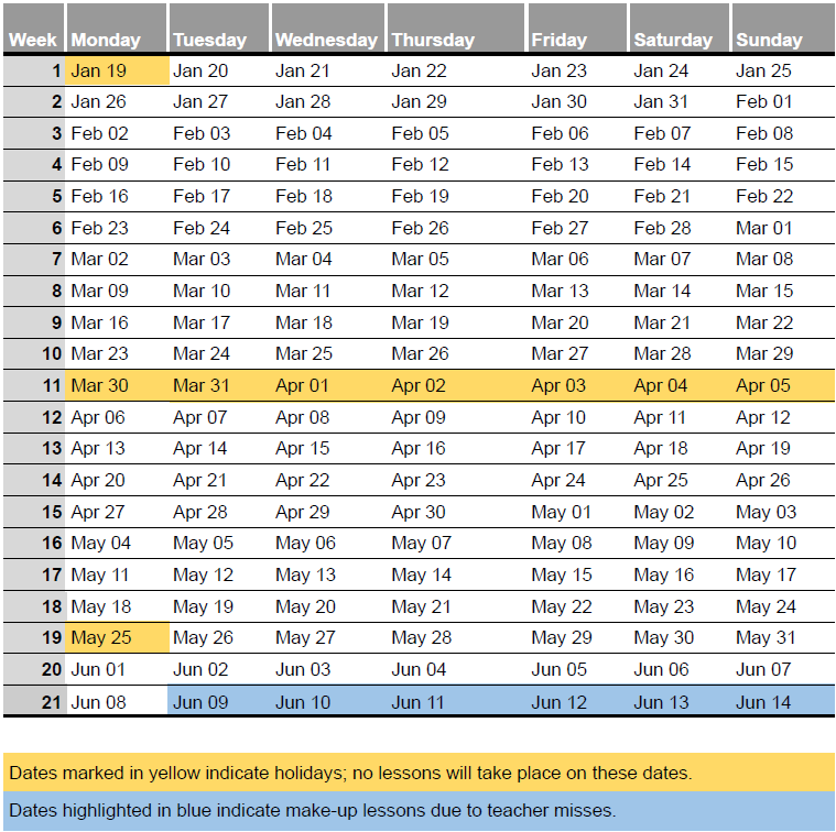 Jan 19, 2026: Martin Luther King Jr. Day (no lessons)